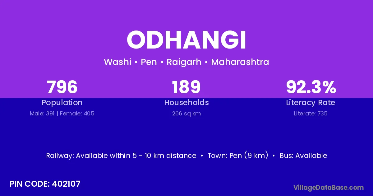 Pen (9 km) is the nearest town to Odhangi village for major economic activities and is located approximately 9 km away.