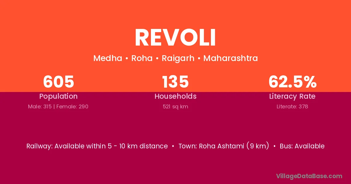 The literacy rate of Revoli village is 75.38%. Male literacy stands at 83.17% and female literacy at 67.02%.