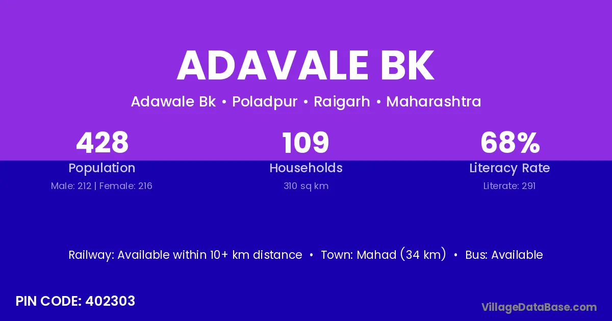 Mahad (34 km) is the nearest town to Adavale Bk village for major economic activities and is located approximately 34 km away.