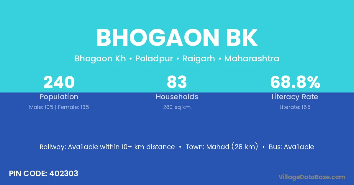 Mahad (28 km) is the nearest town to Bhogaon Bk village for major economic activities and is located approximately 28 km away.
