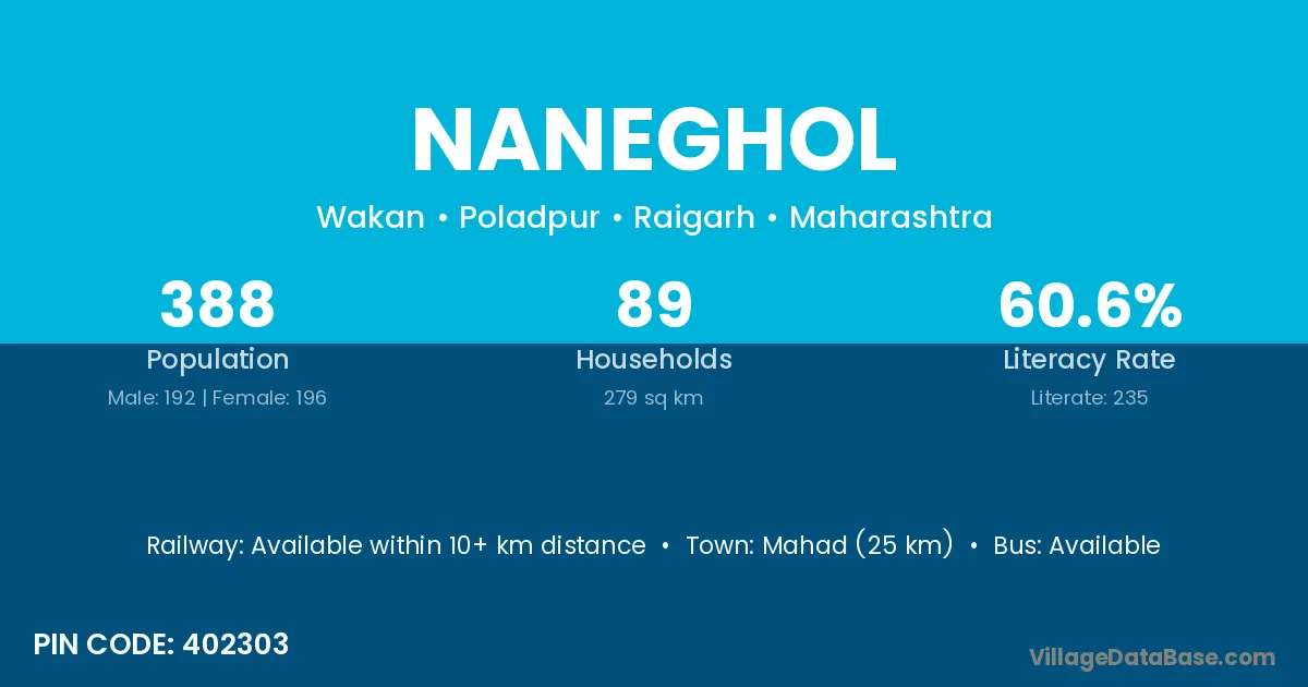 Mahad (25 km) is the nearest town to Naneghol village for major economic activities and is located approximately 25 km away.