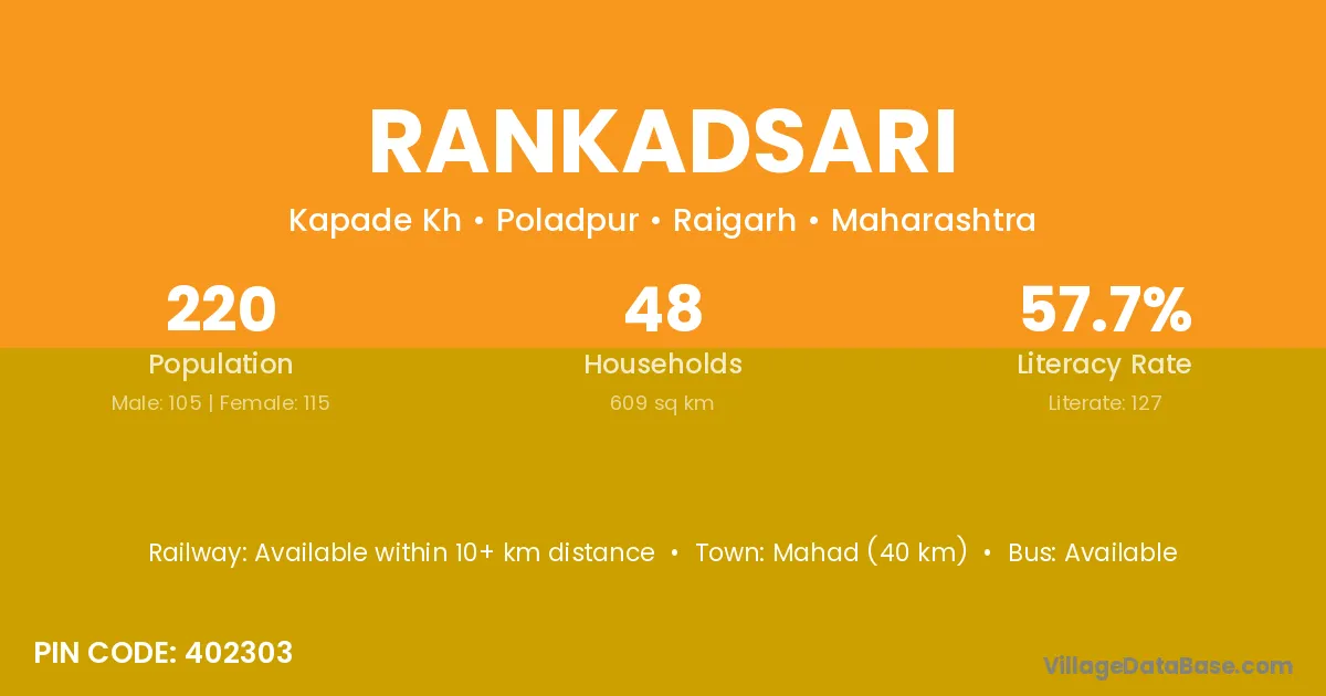 Mahad (40 km) is the nearest town to Rankadsari village for major economic activities and is located approximately 40 km away.