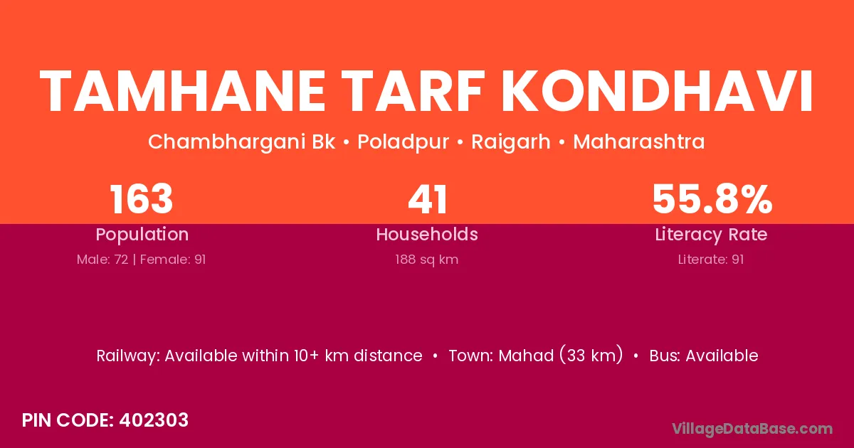Mahad (33 km) is the nearest town to Tamhane Tarf Kondhavi village for major economic activities and is located approximately 33 km away.