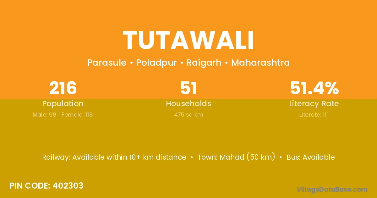 Mahad (50 km) is the nearest town to Tutawali village for major economic activities and is located approximately 50 km away.