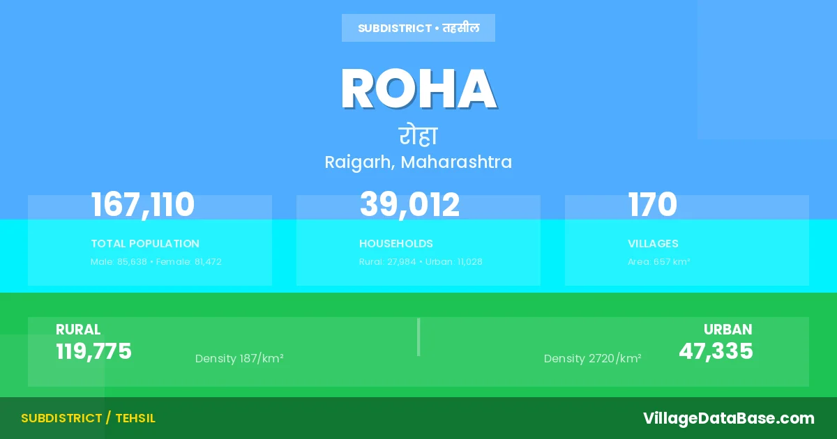 According to the 2011 census The total area of Roha Tehsil is 657 km², with a population of 167110 people. The population density is 254 inhabitants per square kilometre, and there are approximately 39012 houses in the sub district.