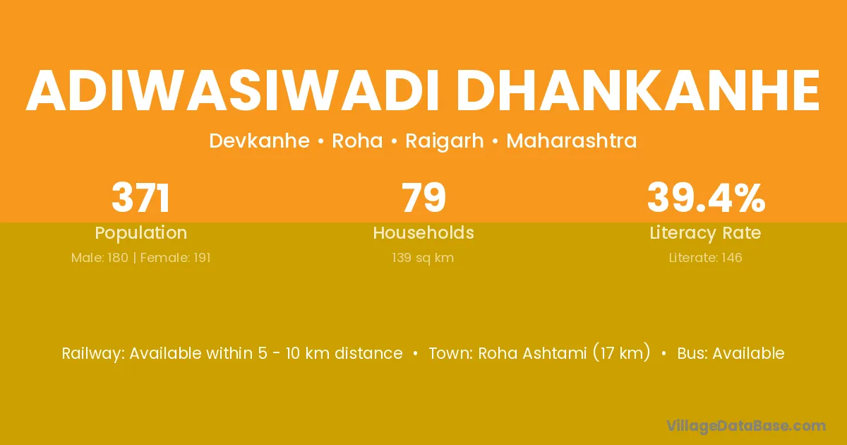 Adiwasiwadi Dhankanhe village has a total population of 371 people, of which 180 are males and 191 are females.
