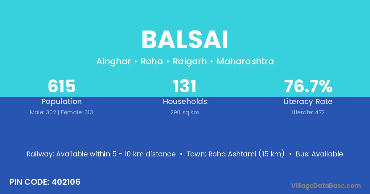 Roha Ashtami (15 km) is the nearest town to Balsai village for major economic activities and is located approximately 15 km away.