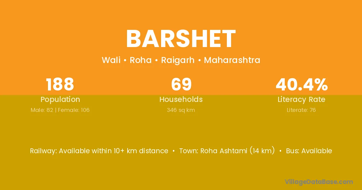 Roha Ashtami (14 km) is the nearest town to Barshet village for major economic activities and is located approximately 14 km away.