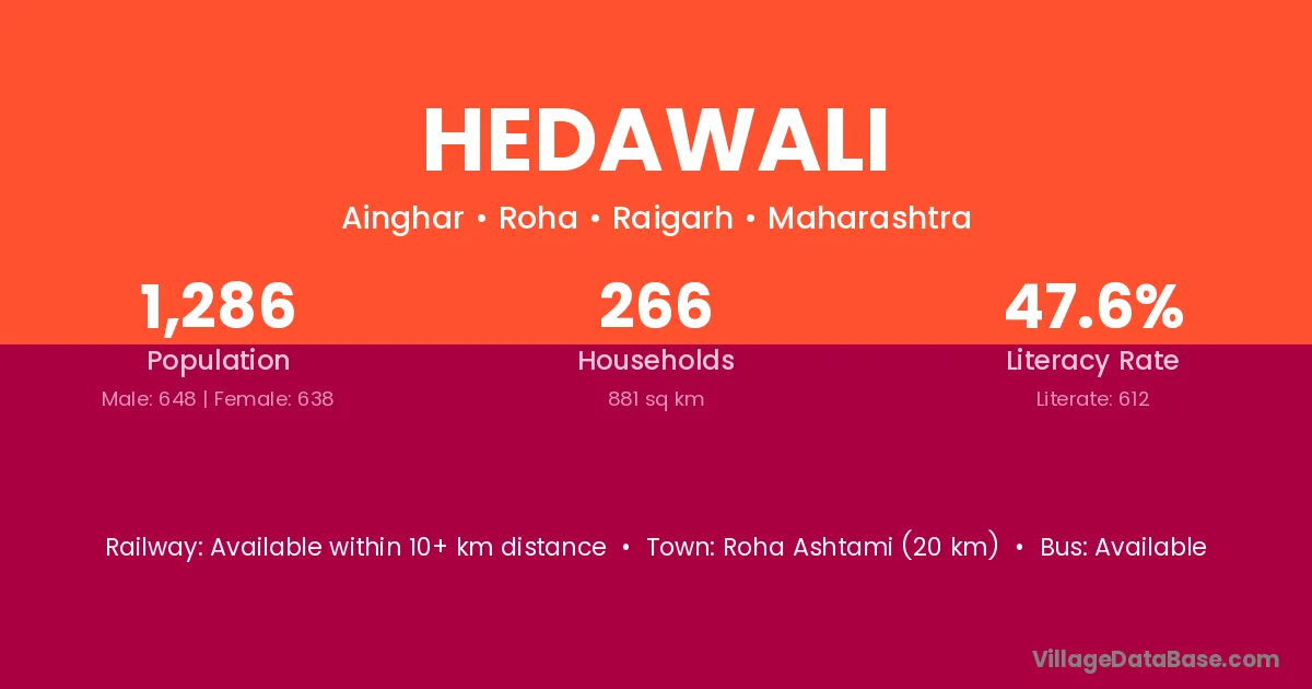 Roha Ashtami (20 km) is the nearest town to Hedawali village for major economic activities and is located approximately 20 km away.