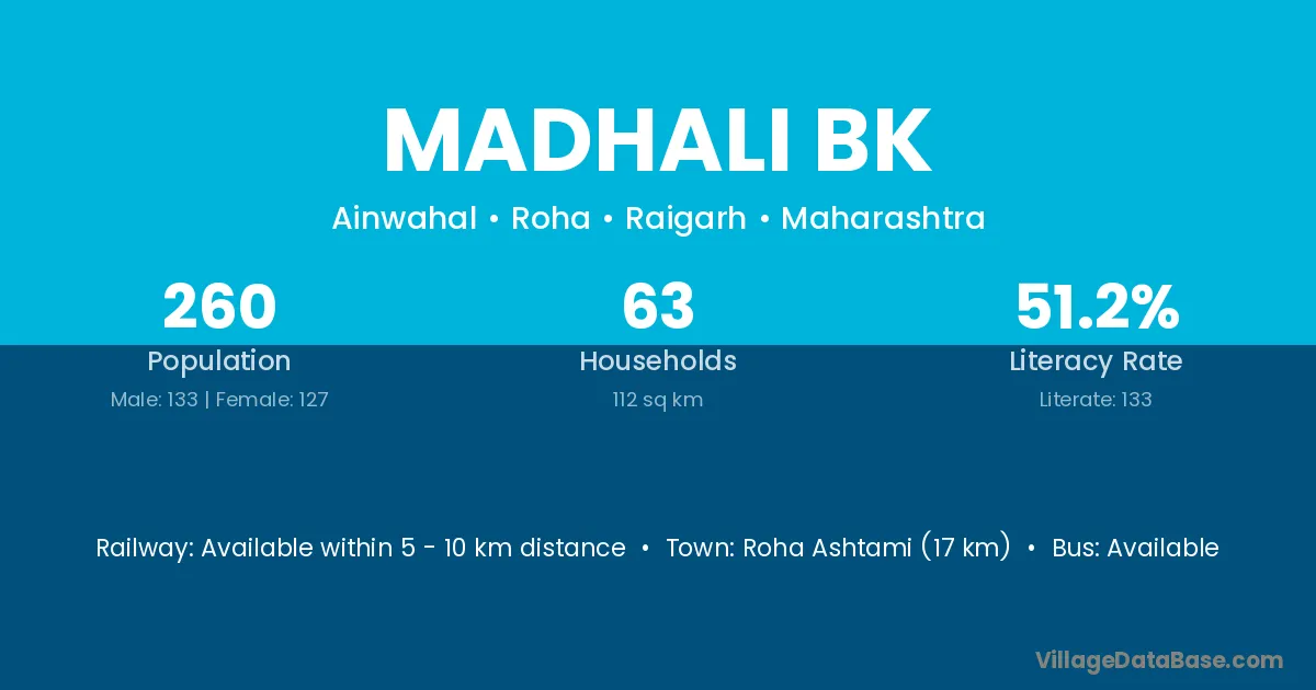 Roha Ashtami (17 km) is the nearest town to Madhali Bk village for major economic activities and is located approximately 17 km away.