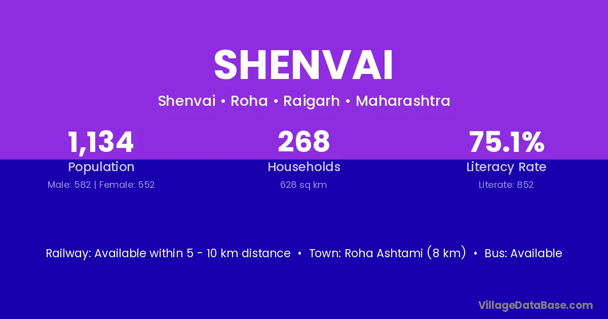Roha Ashtami (8 km) is the nearest town to Shenvai village for major economic activities and is located approximately 8 km away.