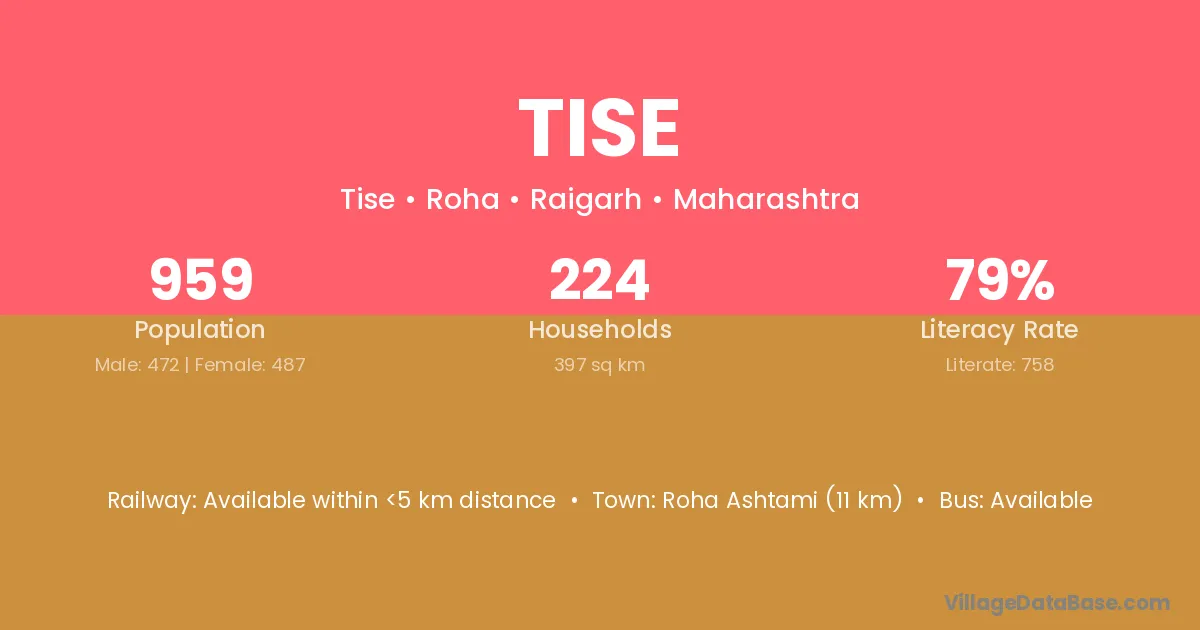 Roha Ashtami (11 km) is the nearest town to Tise village for major economic activities and is located approximately 11 km away.