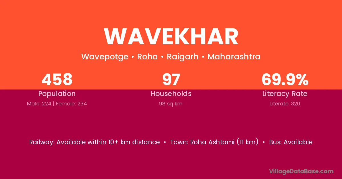 Roha Ashtami (11 km) is the nearest town to Wavekhar village for major economic activities and is located approximately 11 km away.