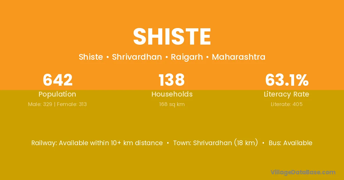 Shrivardhan (18 km) is the nearest town to Shiste village for major economic activities and is located approximately 18 km away.