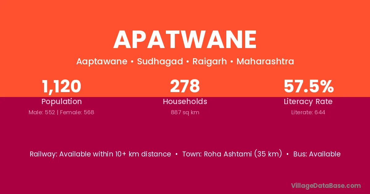 Roha Ashtami (35 km) is the nearest town to Apatwane village for major economic activities and is located approximately 35 km away.