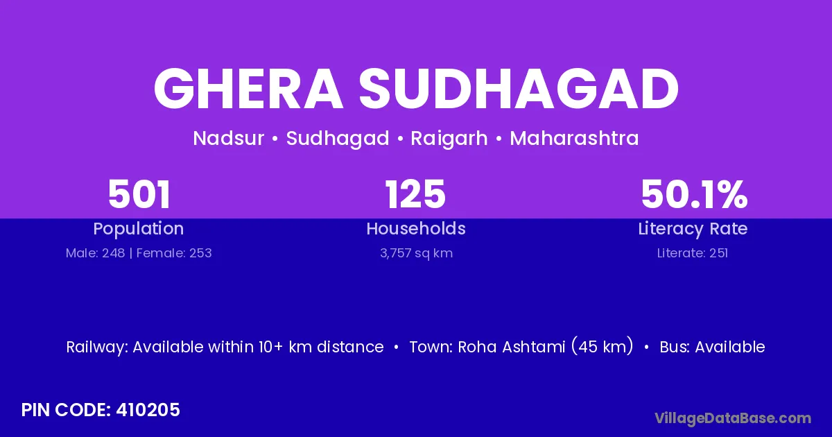 Ghera Sudhagad village has a total population of 501 people, of which 248 are males and 253 are females.