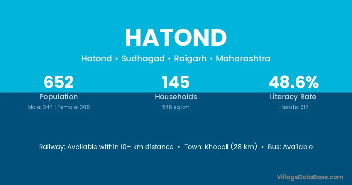 Khopoli (28 km) is the nearest town to Hatond village for major economic activities and is located approximately 28 km away.