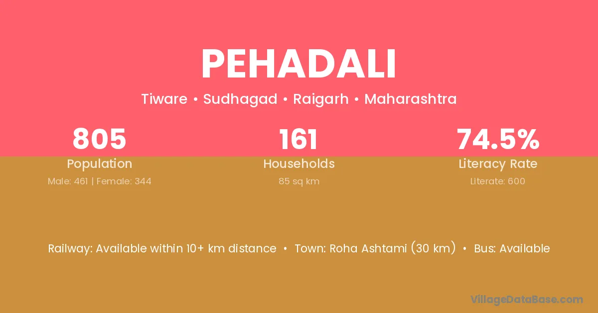Roha Ashtami (30 km) is the nearest town to Pehadali village for major economic activities and is located approximately 30 km away.