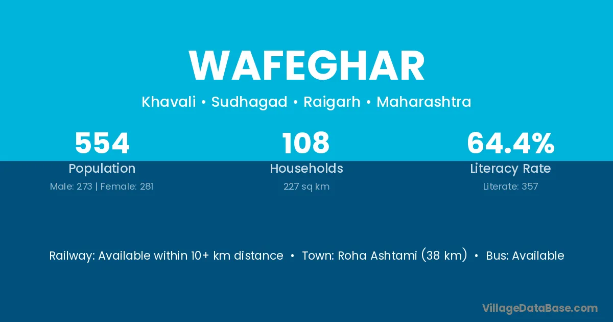 Roha Ashtami (38 km) is the nearest town to Wafeghar village for major economic activities and is located approximately 38 km away.