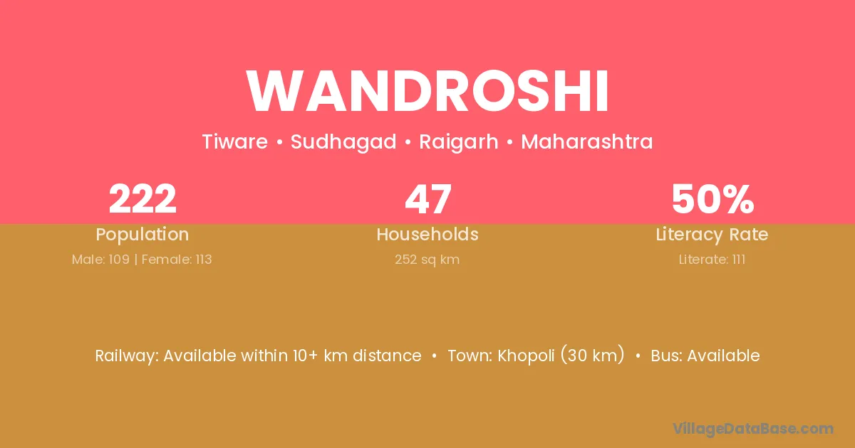 Khopoli (30 km) is the nearest town to Wandroshi village for major economic activities and is located approximately 30 km away.