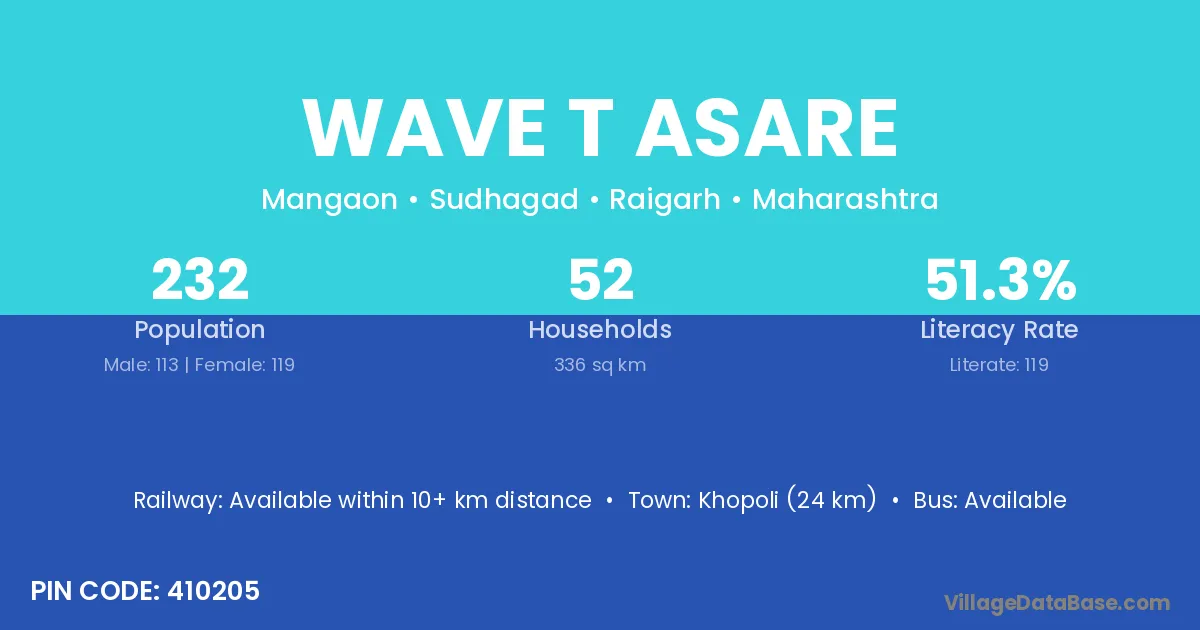 Khopoli (24 km) is the nearest town to Wave T Asare village for major economic activities and is located approximately 24 km away.