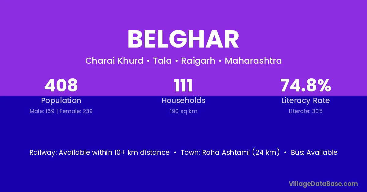 Roha Ashtami (24 km) is the nearest town to Belghar village for major economic activities and is located approximately 24 km away.
