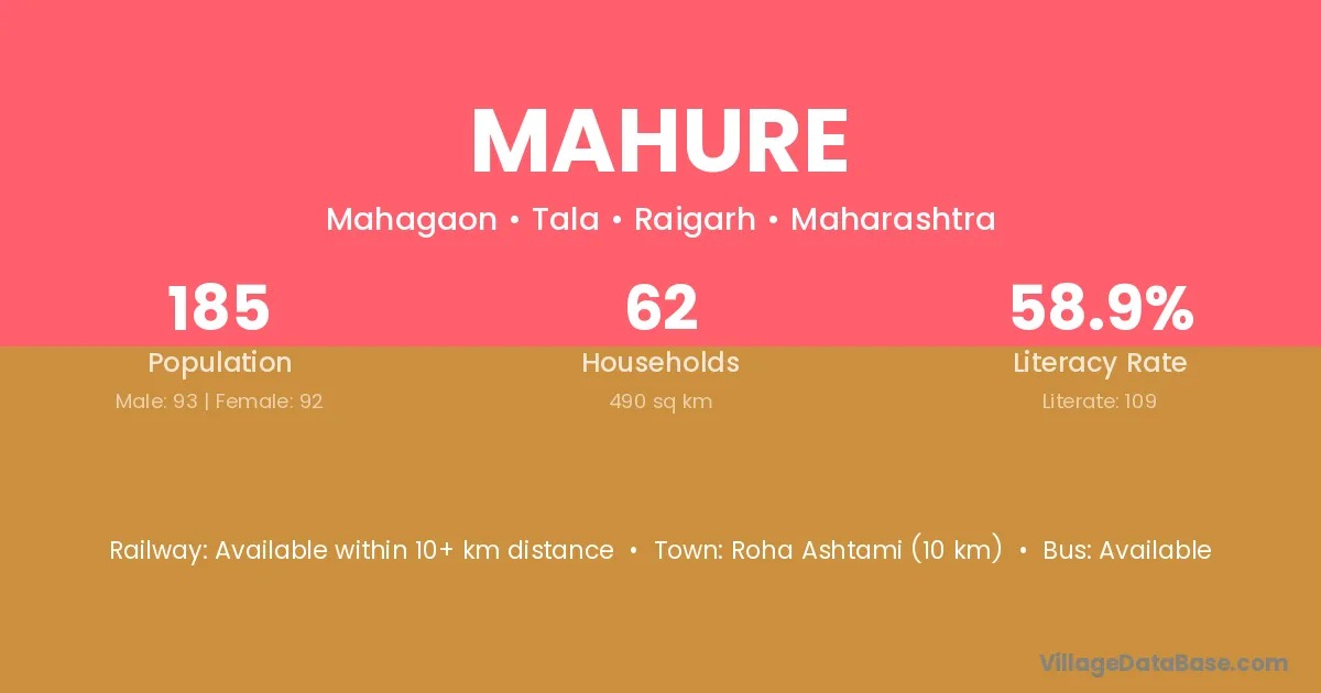 Roha Ashtami (10 km) is the nearest town to Mahure village for major economic activities and is located approximately 10 km away.