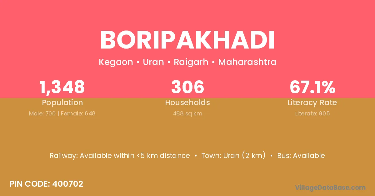 Uran (2 km) is the nearest town to Boripakhadi village for major economic activities and is located approximately 2 km away.