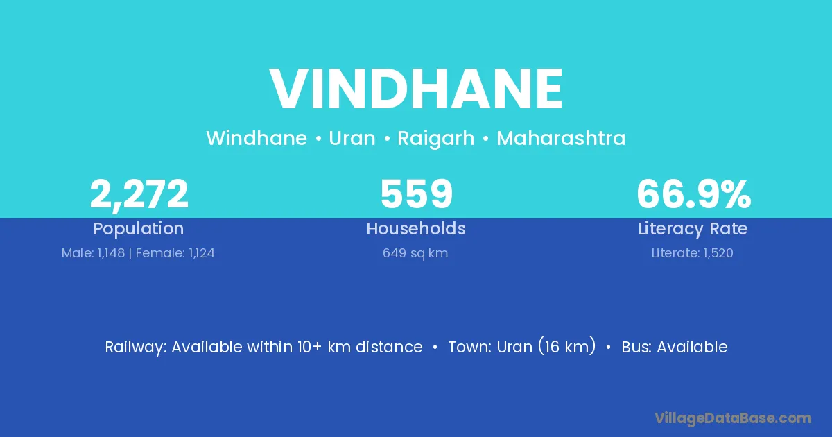Uran (16 km) is the nearest town to Vindhane village for major economic activities and is located approximately 16 km away.
