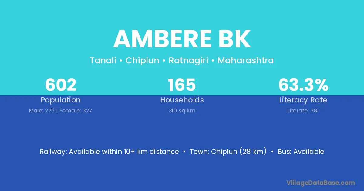 Chiplun (28 km) is the nearest town to Ambere Bk village for major economic activities and is located approximately 28 km away.
