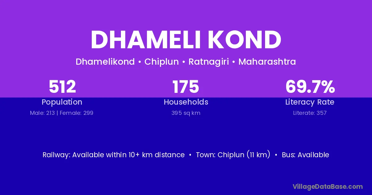 Chiplun (11 km) is the nearest town to Dhameli Kond village for major economic activities and is located approximately 11 km away.