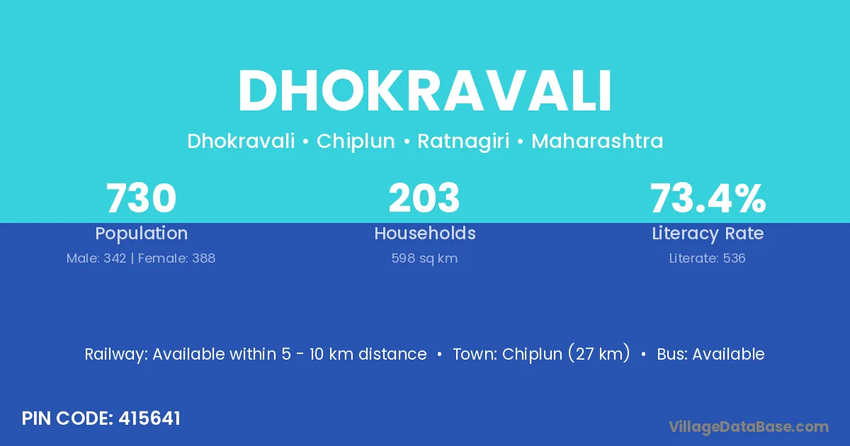 Chiplun (27 km) is the nearest town to Dhokravali village for major economic activities and is located approximately 27 km away.