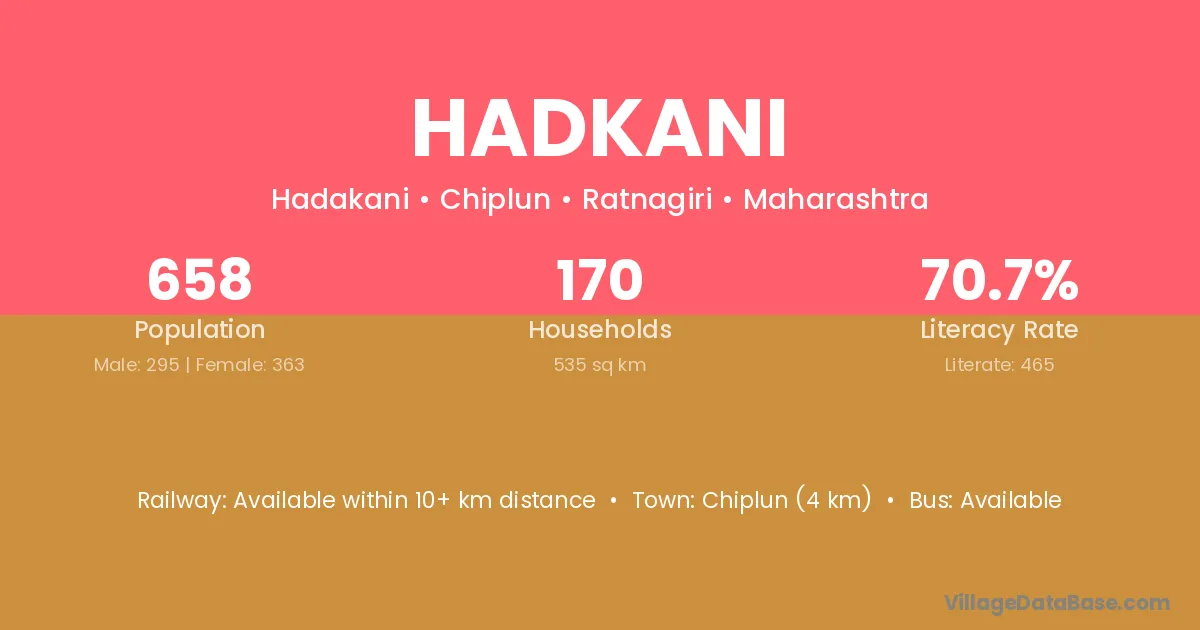 Chiplun (4 km) is the nearest town to Hadkani village for major economic activities and is located approximately 4 km away.