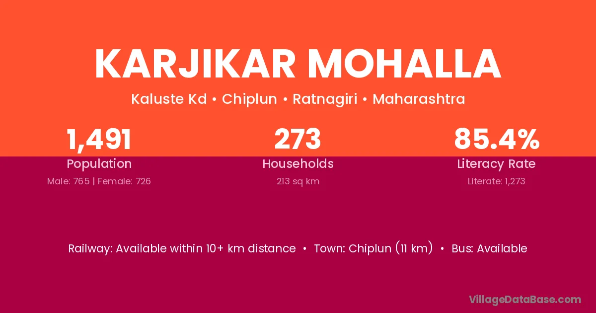 Chiplun (11 km) is the nearest town to Karjikar Mohalla village for major economic activities and is located approximately 11 km away.