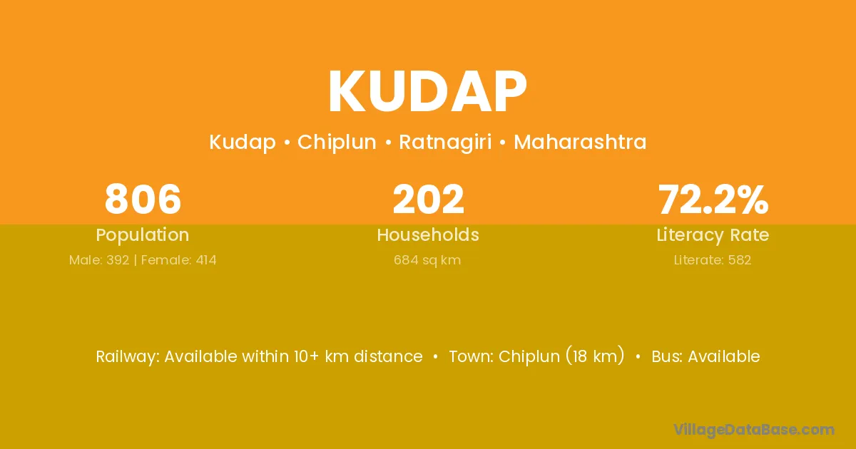 Chiplun (18 km) is the nearest town to Kudap village for major economic activities and is located approximately 18 km away.