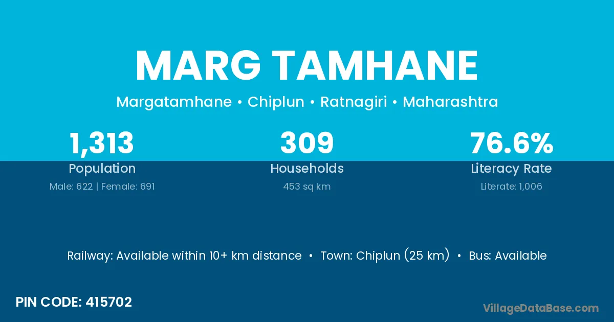 Chiplun (25 km) is the nearest town to Marg Tamhane village for major economic activities and is located approximately 25 km away.