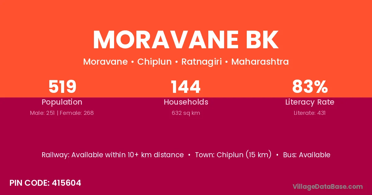 Chiplun (15 km) is the nearest town to Moravane Bk village for major economic activities and is located approximately 15 km away.