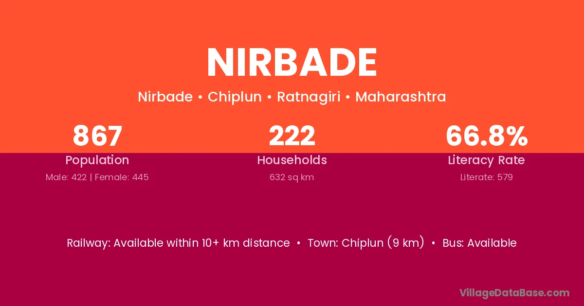 Chiplun (9 km) is the nearest town to Nirbade village for major economic activities and is located approximately 9 km away.