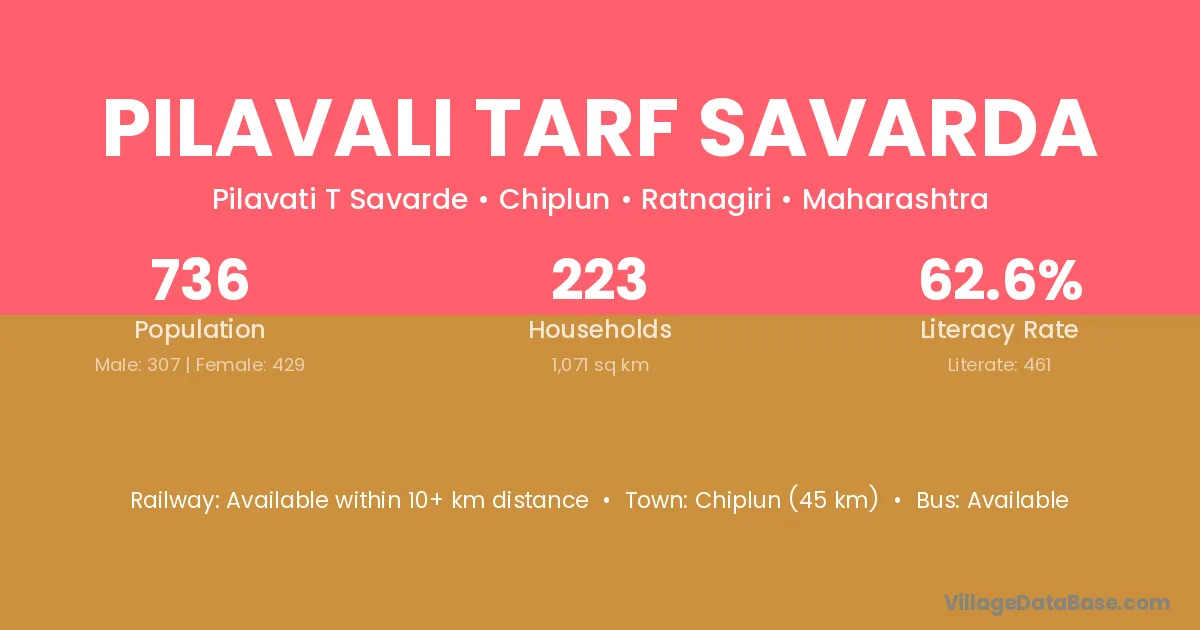Chiplun (45 km) is the nearest town to Pilavali Tarf Savarda village for major economic activities and is located approximately 45 km away.