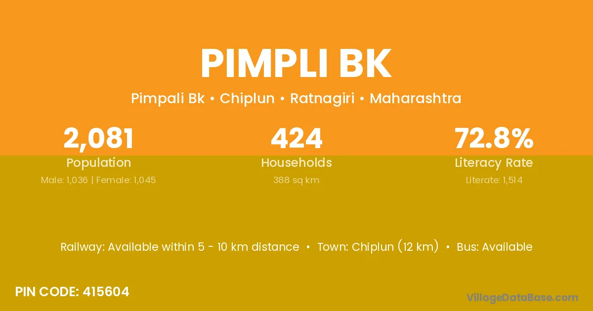 Chiplun (12 km) is the nearest town to Pimpli Bk village for major economic activities and is located approximately 12 km away.