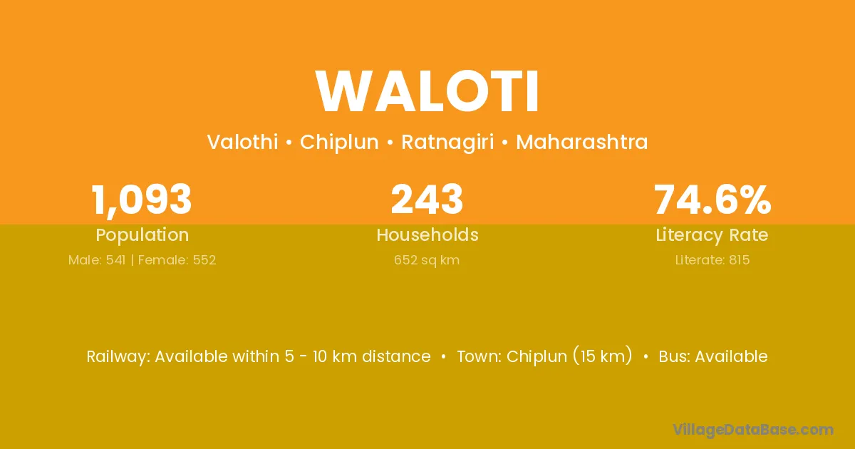 Chiplun (15 km) is the nearest town to Waloti village for major economic activities and is located approximately 15 km away.
