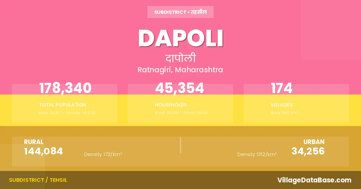 According to the 2011 census The total area of Dapoli Tehsil is 866 km², with a population of 178340 people. The population density is 206 inhabitants per square kilometre, and there are approximately 45354 houses in the sub district.