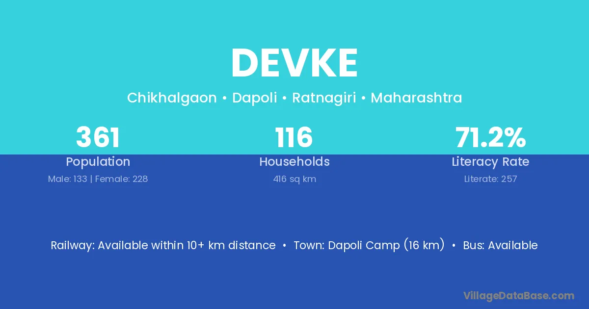 Dapoli Camp (16 km) is the nearest town to Devke village for major economic activities and is located approximately 16 km away.