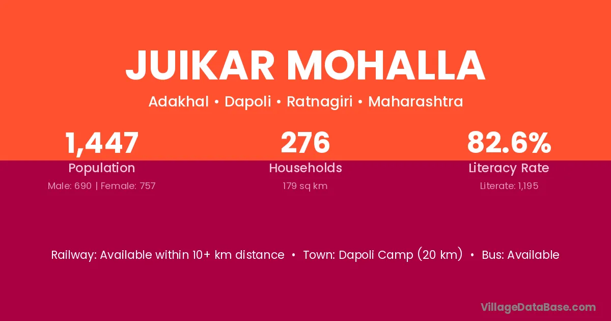 Dapoli Camp (20 km) is the nearest town to Juikar Mohalla village for major economic activities and is located approximately 20 km away.