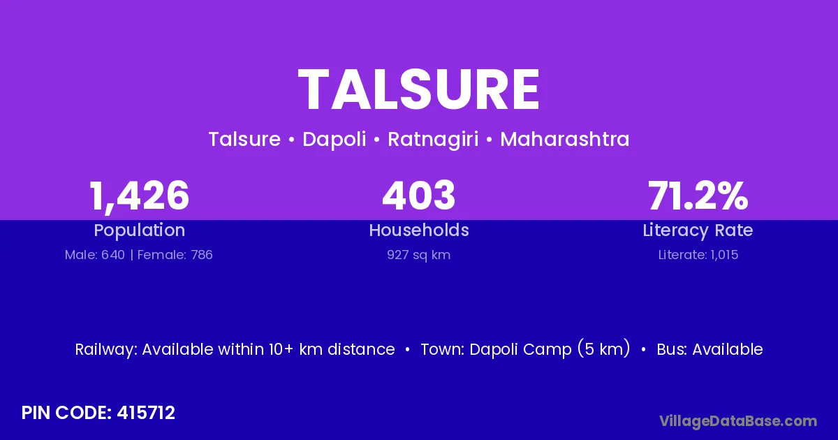 Dapoli Camp (5 km) is the nearest town to Talsure village for major economic activities and is located approximately 5 km away.