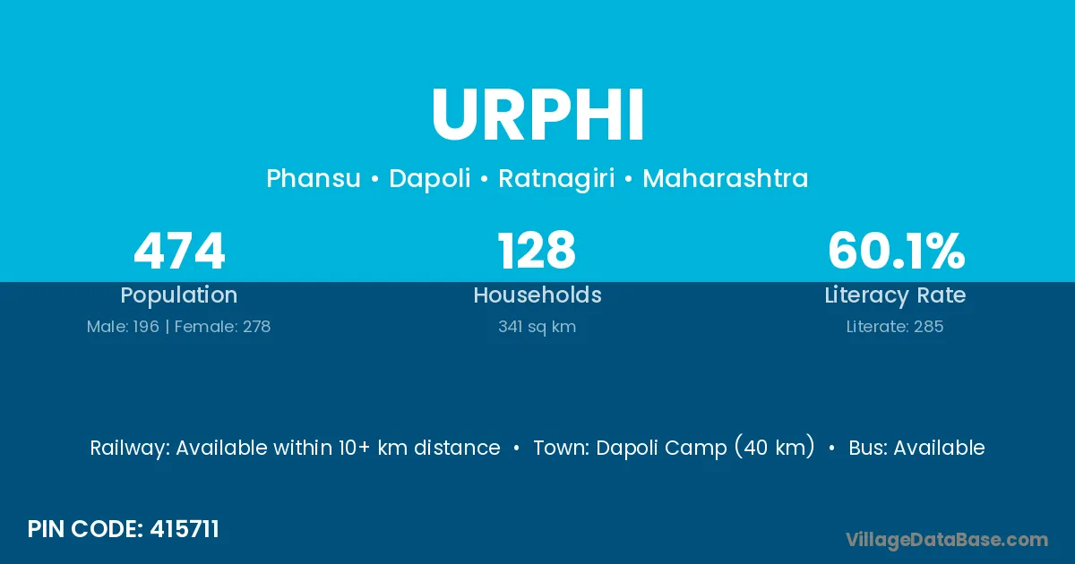Dapoli Camp (40 km) is the nearest town to Urphi village for major economic activities and is located approximately 40 km away.