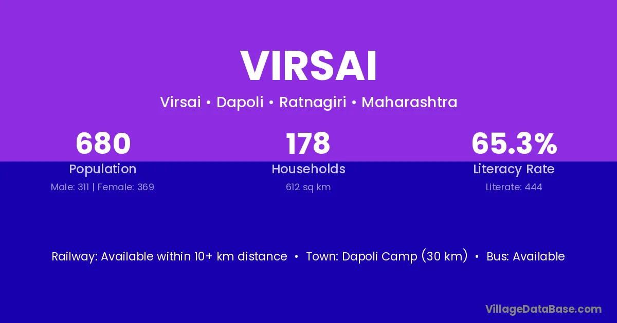 Dapoli Camp (30 km) is the nearest town to Virsai village for major economic activities and is located approximately 30 km away.