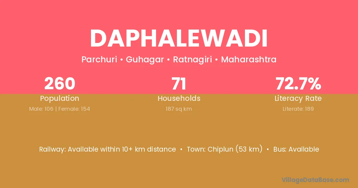 Daphalewadi village has a total population of 260 people, of which 106 are males and 154 are females.