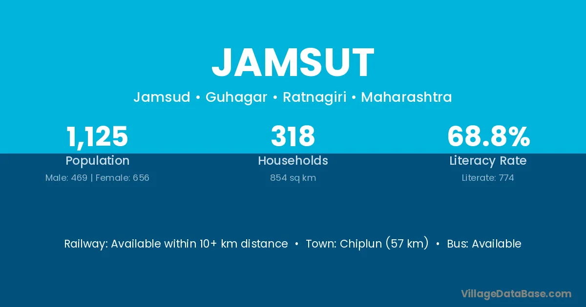 Chiplun (57 km) is the nearest town to Jamsut village for major economic activities and is located approximately 57 km away.