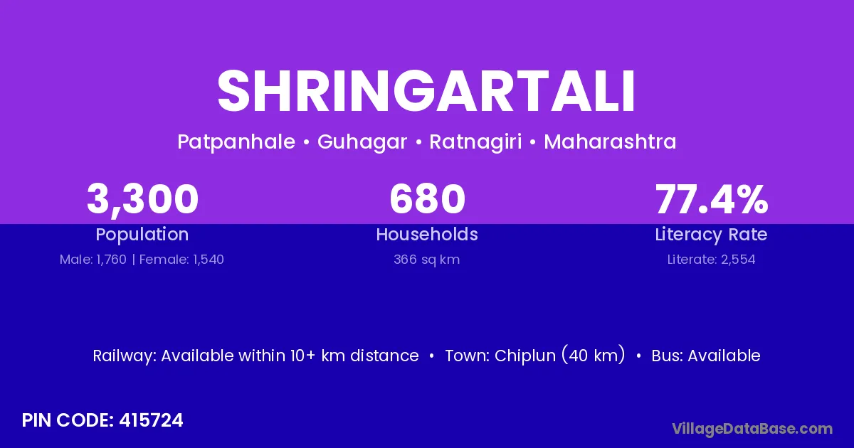 Chiplun (40 km) is the nearest town to Shringartali village for major economic activities and is located approximately 40 km away.